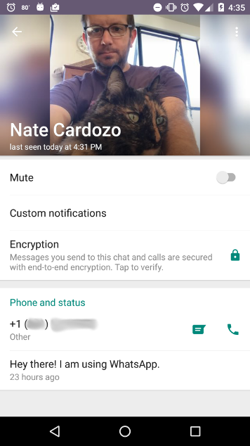 WhatsApp ha tomado una decisión interesante de no repetir este mismo proceso en su aplicación. En su lugar, se presenta un código QR distinto para cada interacción que se comparte, de manera que María y José estarán escaneando el mismo código QR entre sus dispositivos. Presumiblemente, su razonamiento es que se vuelve más intuitivo para que ambas partes puedan verificar exactamente la misma imagen (que en realidad consiste en las huellas digitales de María y José concatenadas) Lo interesante acerca de esta decisión es que apunta hacia una cierta consideración para introducir el concepto de comprobación de llaves para millones de personas. Por el contrario, la plataforma de mensajería iMessage de Apple, que ganó notoriedad el año pasado por su propio uso del cifrado de fin a fin, no permite a los usuarios verificar las llaves entre ellos en absoluto. WhatsApp está demostrando al mundo que no es necesario sacrificar la facilidad de uso con el fin de proporcionar características significativas, tales como formas de verificar la autenticidad del contacto. A fin de verificar la identidad de un contacto, en primer lugar usted querrá asegurarse de que su contacto cuenta con la actualización de WhatsApp que actualmente es compatible con las nuevas características de seguridad. Usted puede hacer esto en el sistema Android mediante la visualización de los detalles del contacto (Ilustraciones en idioma inglés):