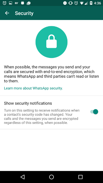 Uno de los ajustes que aquellos conscientes de la seguridad deben de cambiar es mostrar las notificaciones de seguridad. Esto asegura que si cambia la llave de cifrado de sus contactos, usted será notificado de este cambio, de este modo usted sabrá que tiene que verificar de nuevo los códigos de seguridad. Con Signal estas notificaciones se muestran siempre, pero con WhatsApp son opcionales y están desactivadas de manera predeterminada. Para cambiar esto en el sistema Android, vaya a Ajustes → Cuenta → Seguridad, y deslice a la derecha la opción 'Mostrar las notificaciones de seguridad'.
