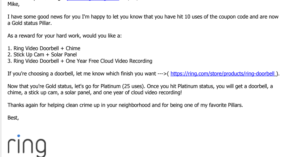 A few months later, in July 2016, Ring was working with an LAPD officer to distribute a discount code that would allow officers to purchase Ring cameras for $50 off. As a growing number of people used his discount code, Ring offered the officer more and more free equipment.