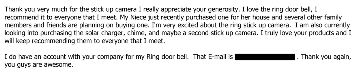 The LAPD released over 3,000 pages of emails from 2016 between Ring representatives and LAPD personnel in response to the CPRA requests. The records show that leading up to Ring’s official launch of partnerships with police departments—which now number almost 150 in California and over 2000 across the country—Ring worked steadily with Los Angeles police officers to provide free or discounted cameras for official and personal use, and in return, the LAPD worked to encourage the spread of Ring’s products throughout the community. The emails show officers were ready to tout the Ring camera as a device they used themselves, one they “love,” “completely believe in,” and “support.”